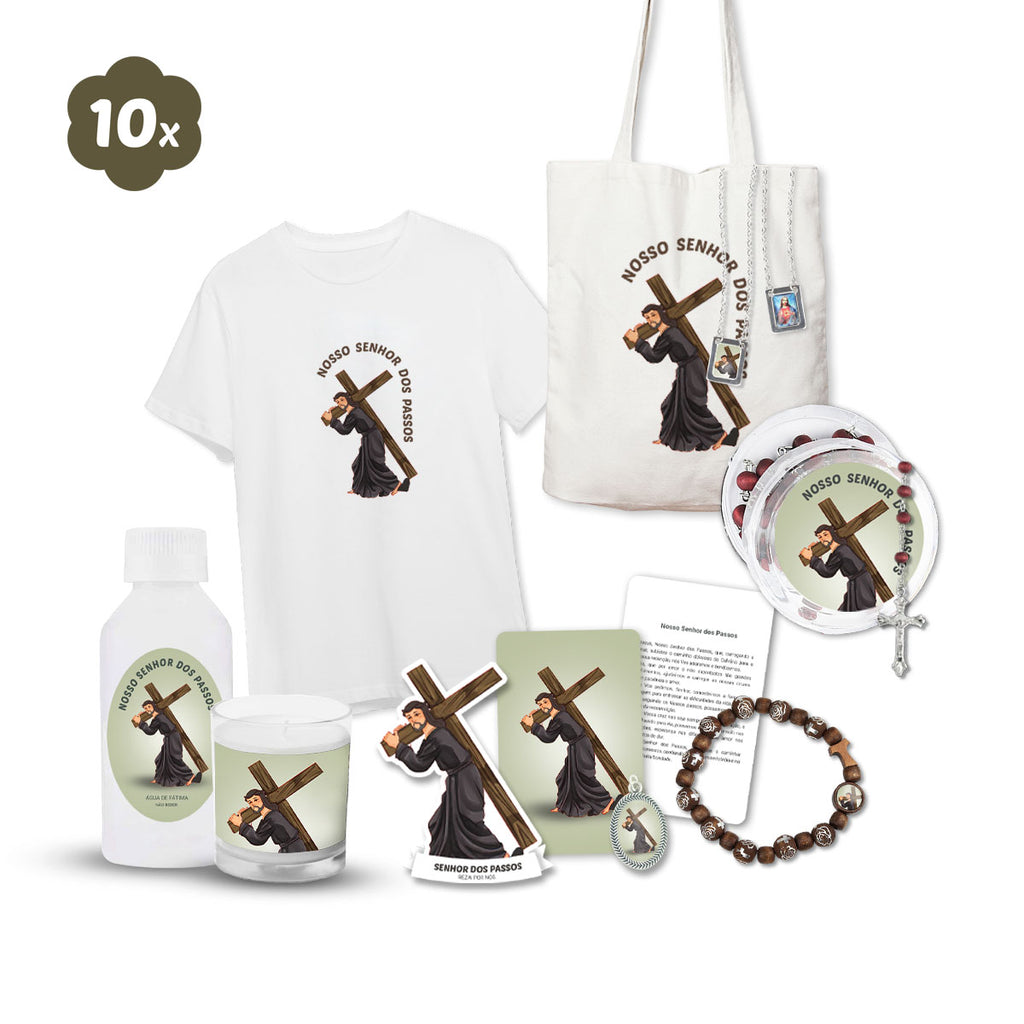 Our Lord of the Steps's Pack, ideal to give to someone very special. The pack will be sent in the selected language and includes: T-shirt - Cotton bag - Rosary with box and prayer - Scapular - Candle - 100ml bottle with water of Fátima - Sticker - Bracelet - Card with Prayer
