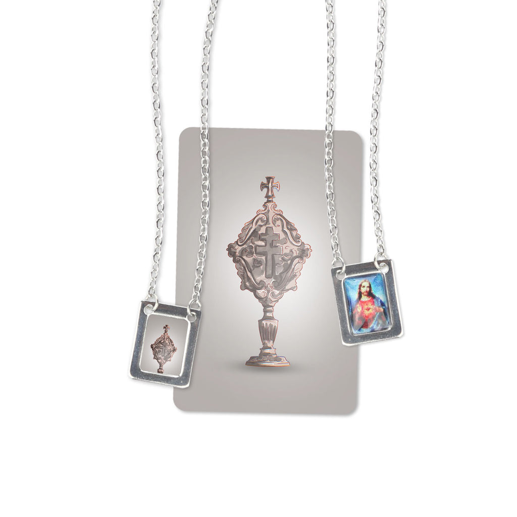 Catholic scapular in stainless steel, with an image of The Holy Wood, including a prayer card in the selected language. Length 30 cm