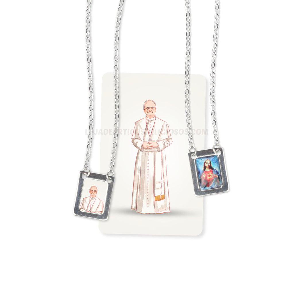 Catholic scapular in stainless steel, with an image of Pope Leo XIV , including a prayer card in the selected language. Length 30 cm