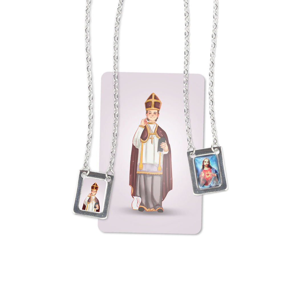 Catholic scapular in stainless steel, with an image of Saint Ovid, including a prayer card in the selected language. Length 30 cm