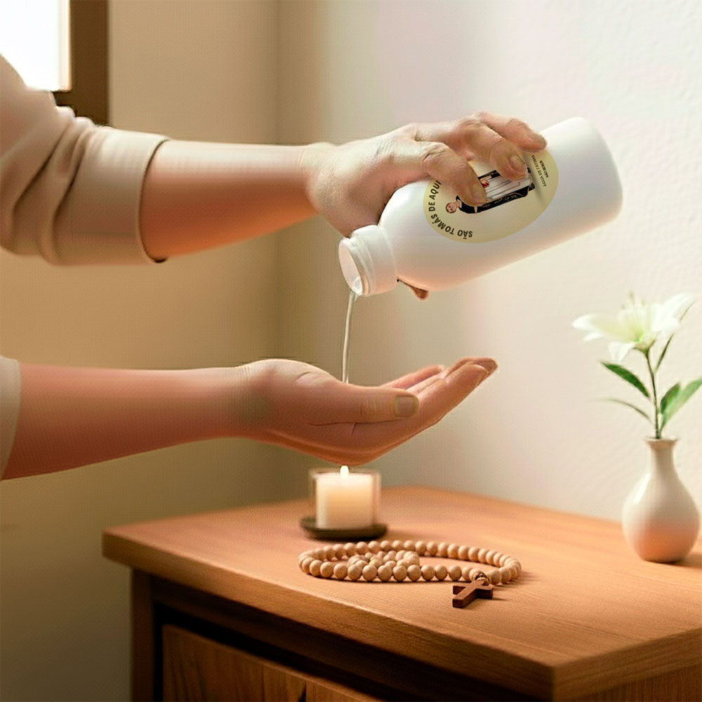 Plastic bottle with water from Fátima, city of Peace and Catholic miracles. The bottle is illustrated with the image of Saint Thomas Aquinas, ideal for blessing your beloved belongings. Measurements: 12 cm x 5 cm x 5 cm - Capacity: 100ml