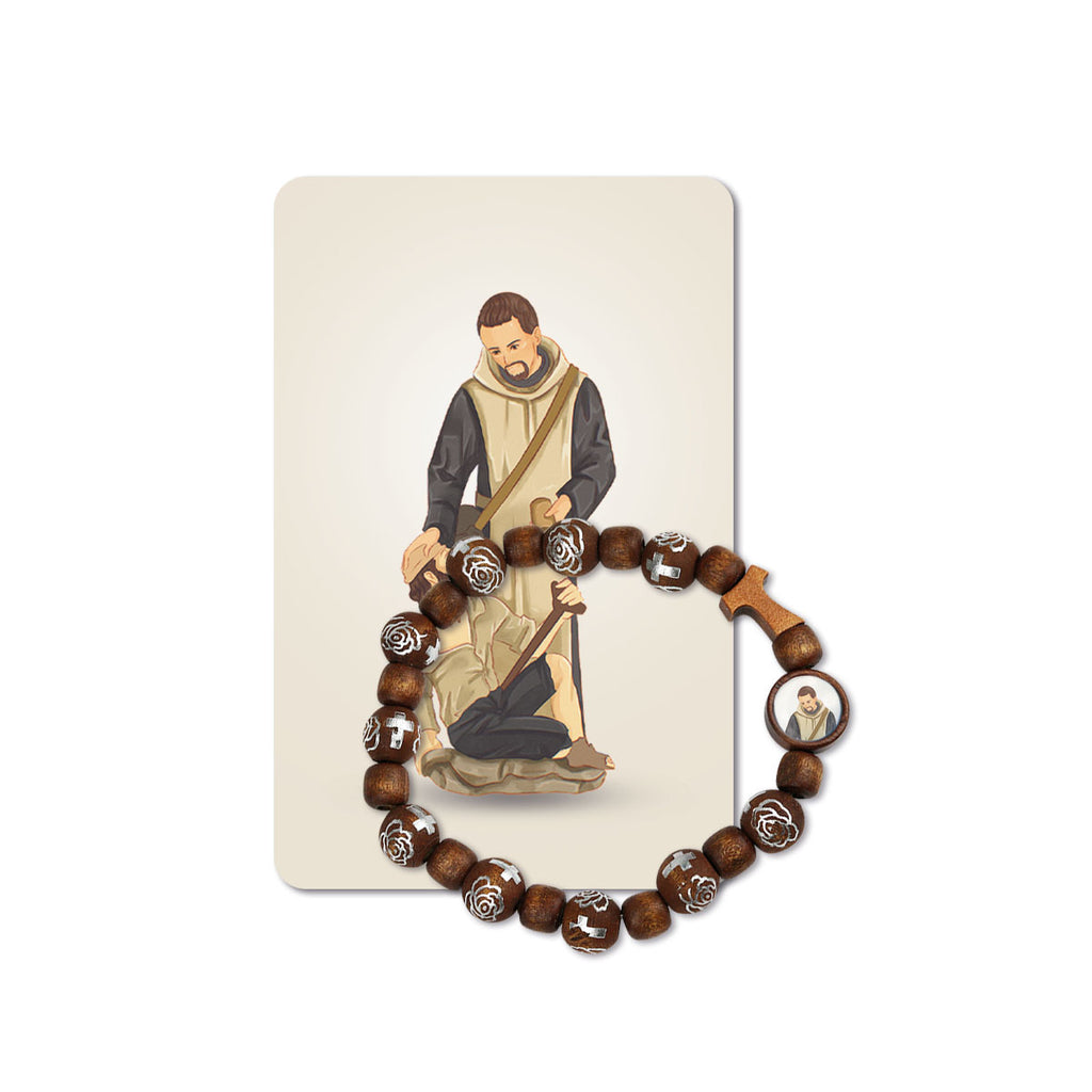 Saint John of God Bracelet with wooden beads, including card with prayer in the selected language. Adjustable elastic strap.