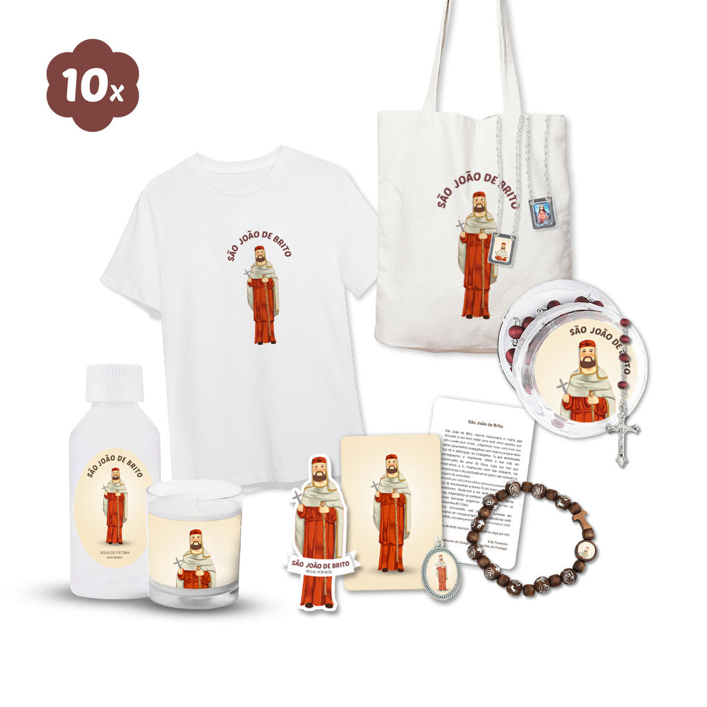 Saint John de Britto's Pack, ideal to give to someone very special. The pack will be sent in the selected language and includes: T-shirt - Cotton bag - Rosary with box and prayer - Scapular - Candle - 100ml bottle with water of Fátima - Sticker - Bracelet - Card with Prayer