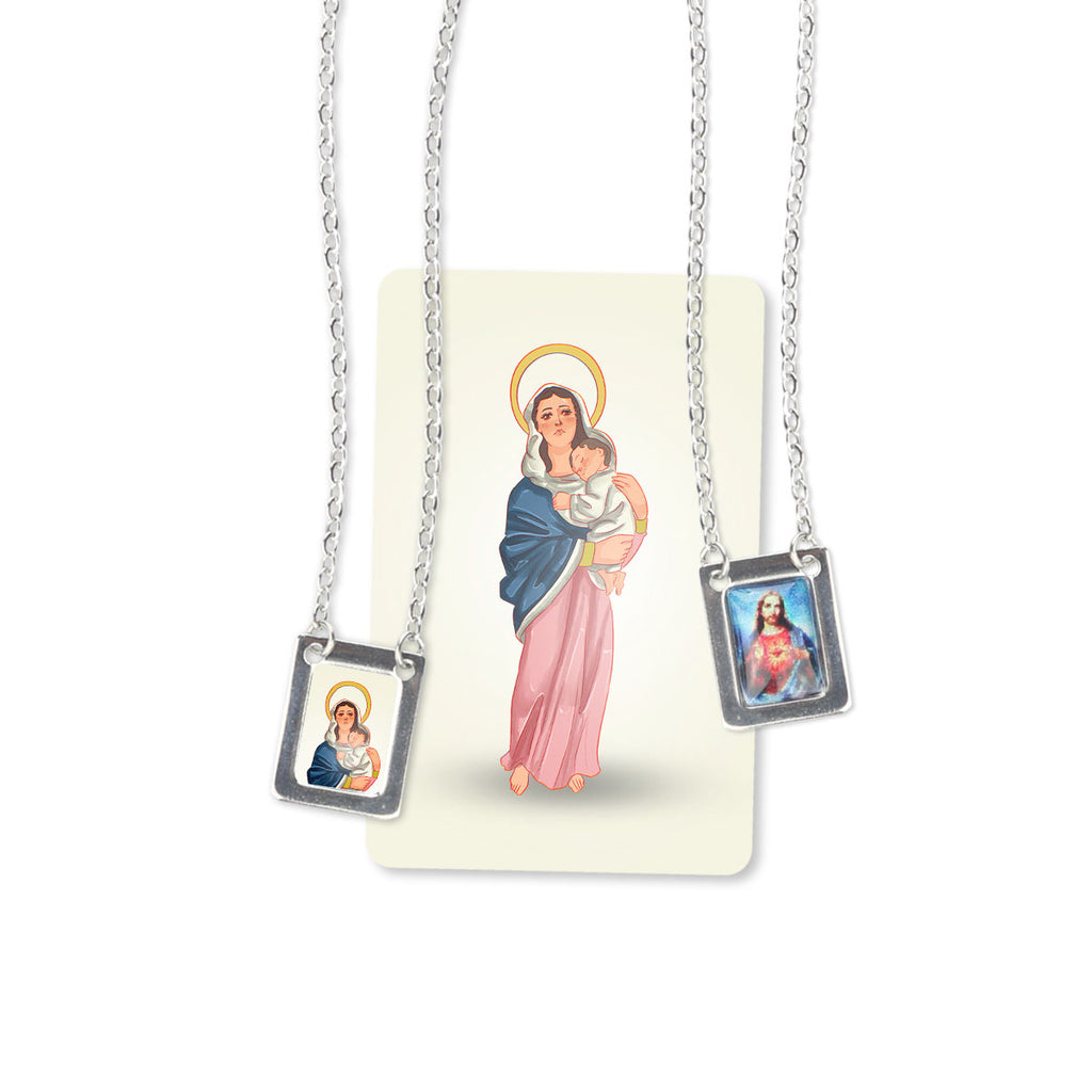 Catholic scapular in stainless steel, with an image of Our Lady Mother of God, including a prayer card in the selected language. Length 30 cm