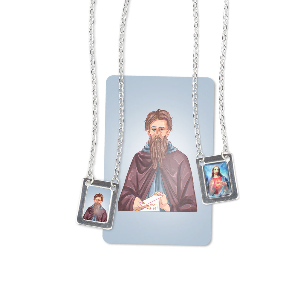 Catholic scapular in stainless steel, with an image of Saint Cyriacus, including a prayer card in the selected language. Length 30 cm