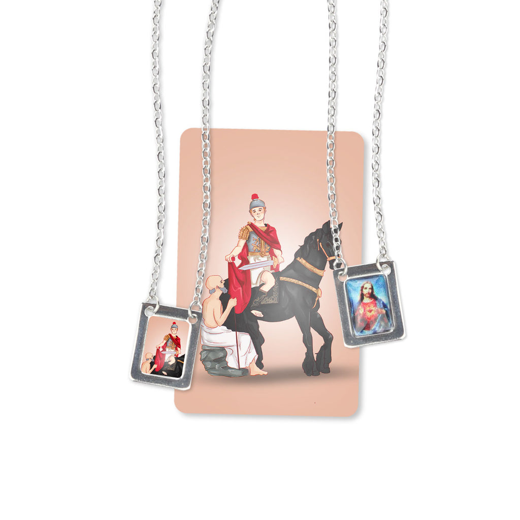 Catholic scapular in stainless steel, with an image of Saint Martin of Tours, including a prayer card in the selected language. Length 30 cm