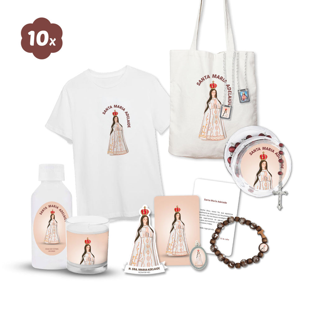 Saint Mary Adelaide's Pack, ideal to give to someone very special. The pack will be sent in the selected language and includes: T-shirt - Cotton bag - Rosary with box and prayer - Scapular - Candle - 100ml bottle with water of Fátima - Sticker - Bracelet - Card with Prayer