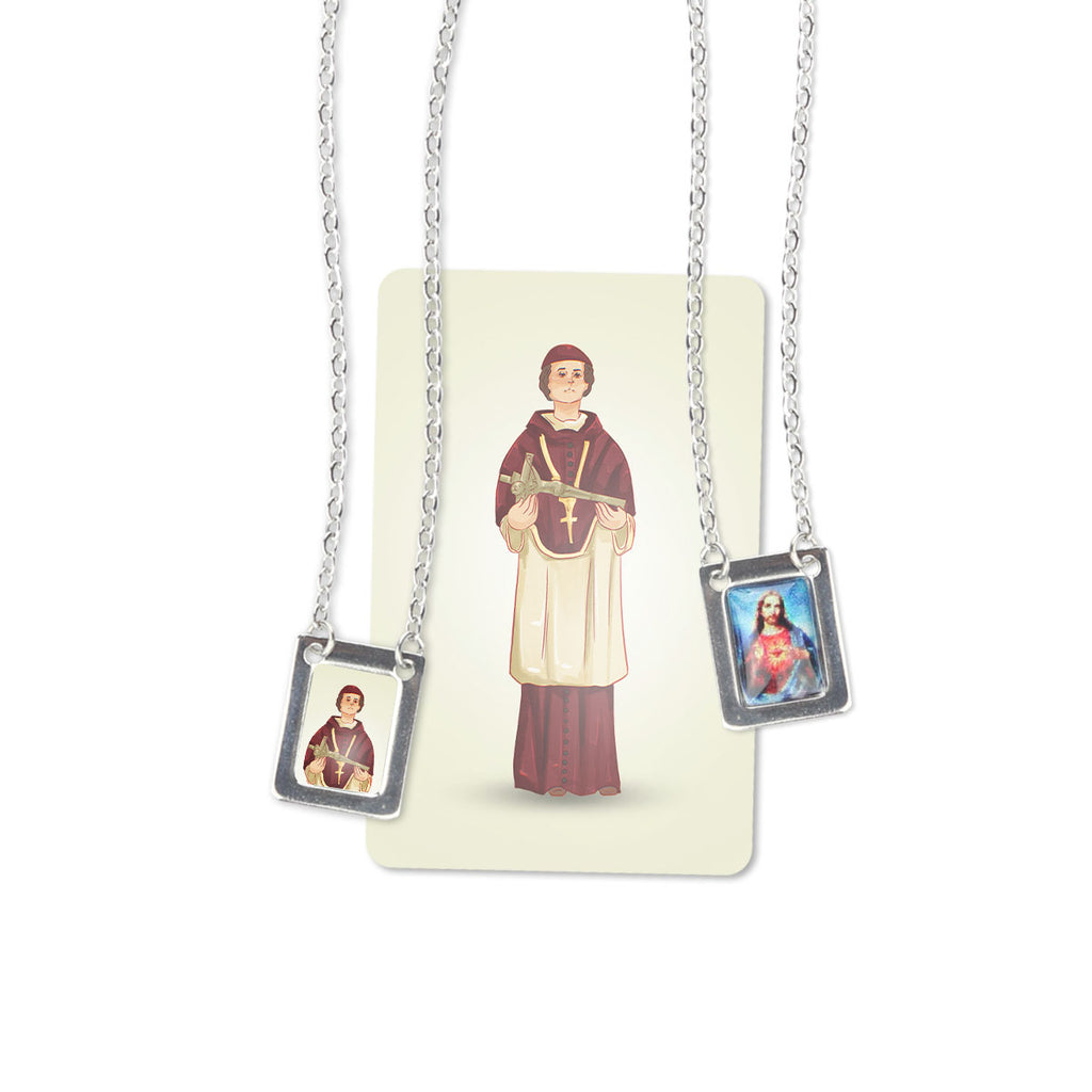 Catholic scapular in stainless steel, with an image of Saint Charles, including a prayer card in the selected language. Length 30 cm
